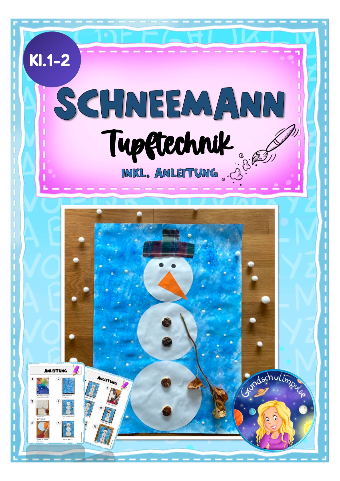 Schneemann Kunstprojekt - Tupftechnik (Klasse 1+2)